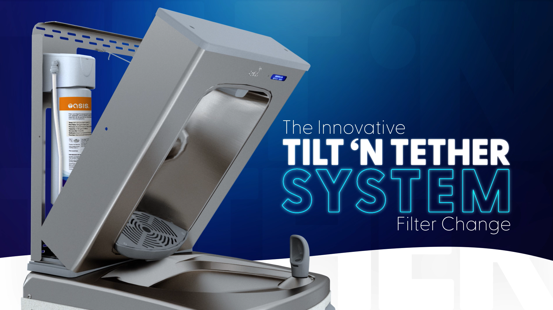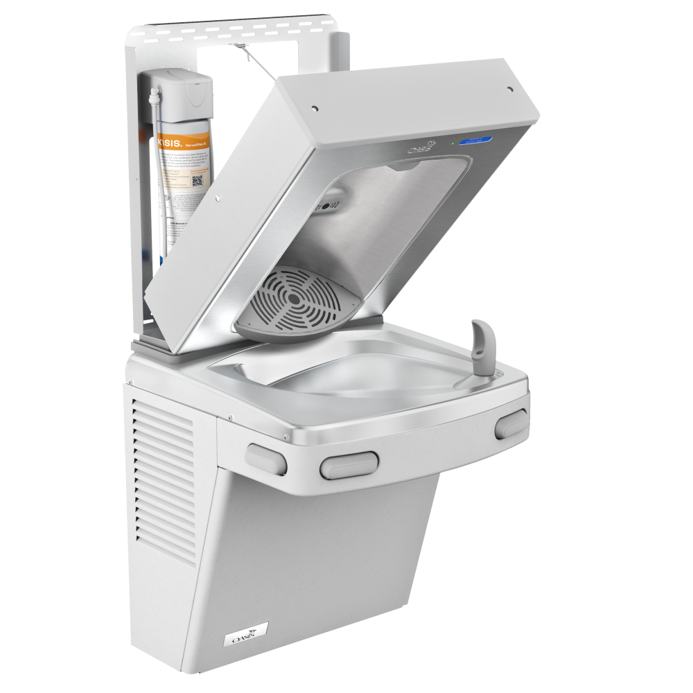 The Tilt ‘N Tether system is a breakthrough in hydration unit serviceability, exclusively designed by OASIS. It provides fast, ergonomic access for maintenance and filter changes without the need to remove or fully disassemble your bottle filler. With just one screwdriver, the unit tilts forward and remains securely tethered, allowing technicians to work safely and efficiently.